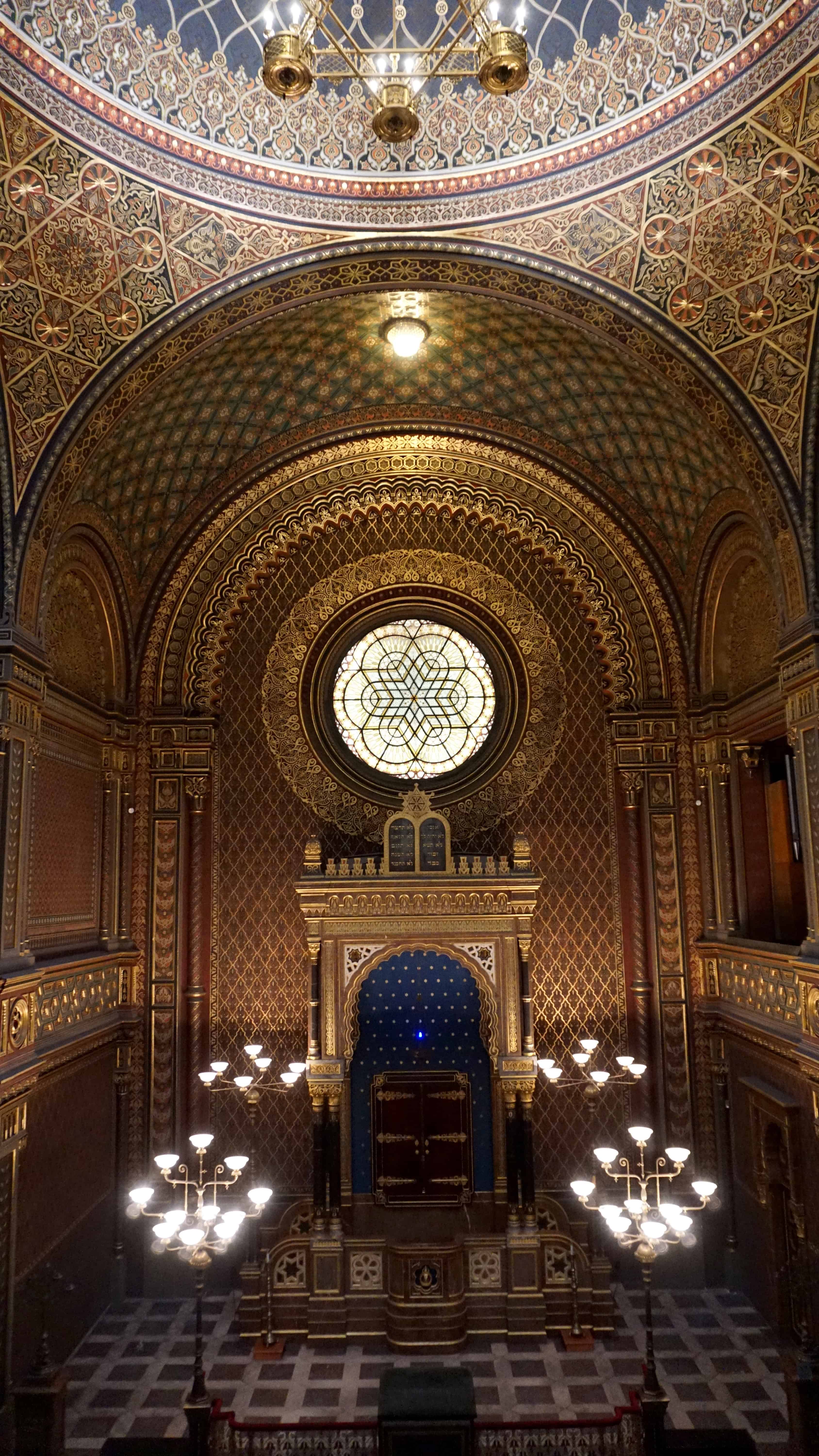 As I previously wrote, the Spanish Synagogue is beautiful! As part of my wanderings of the Jewish Museum, I found my way back to this spectacular building. The late morning light showed the space differently from the night of the concert. After gawking for a few minutes downstairs, I went to the balcony where display cases tell more of the story of Jewish people of Prague. A higher vantage point brought me closer to the magnificent detailed decoration on the ceilings.