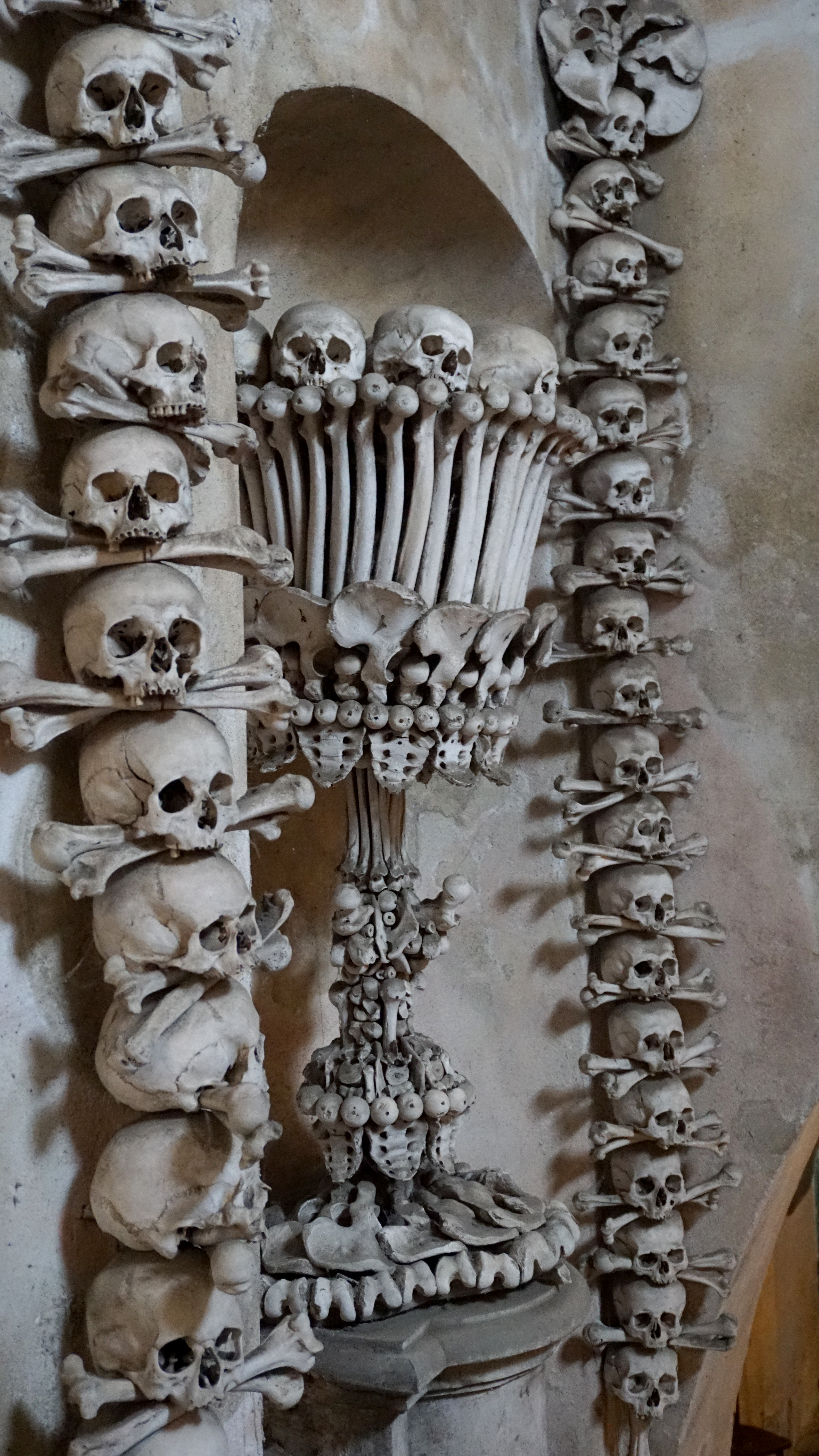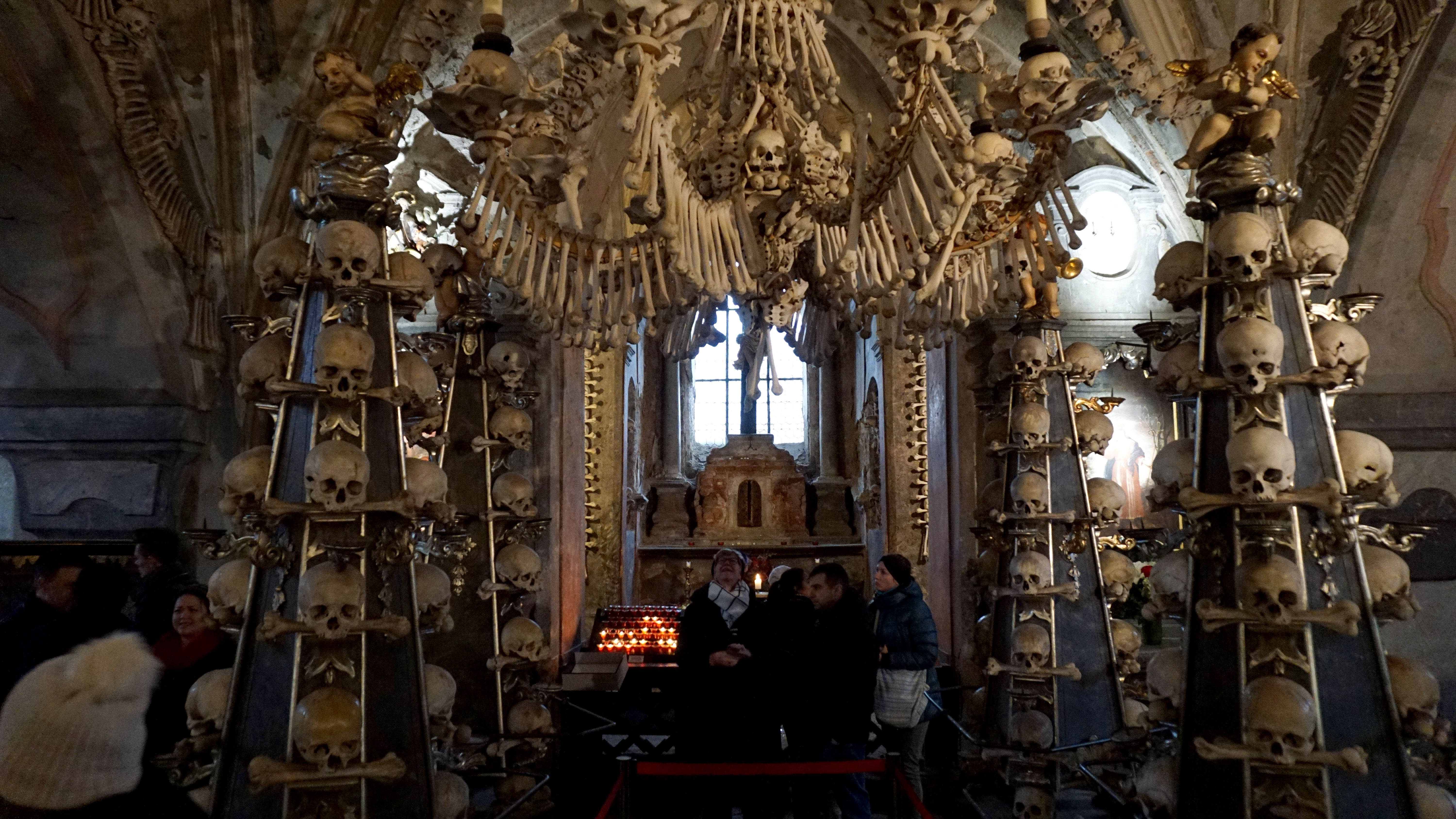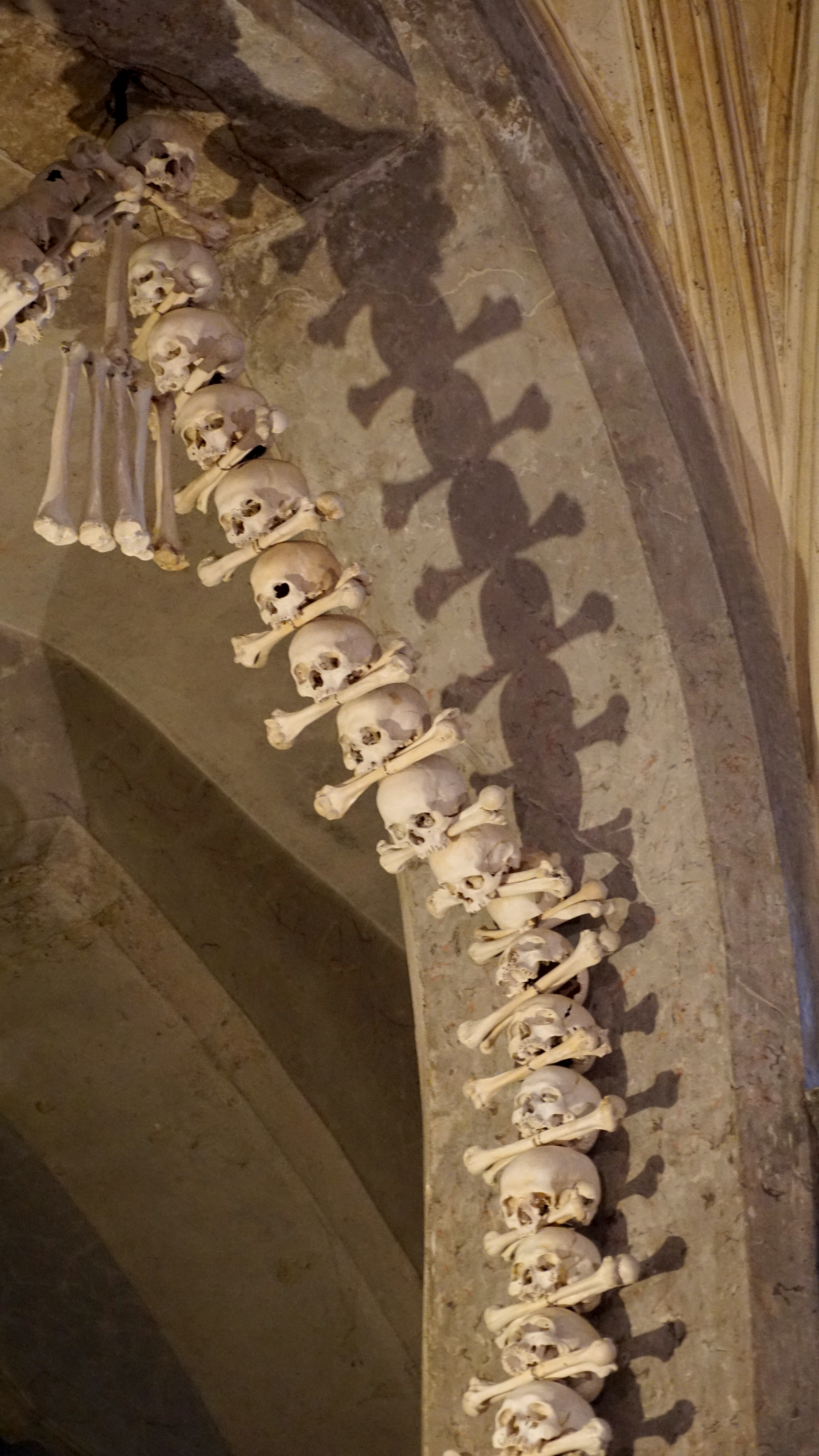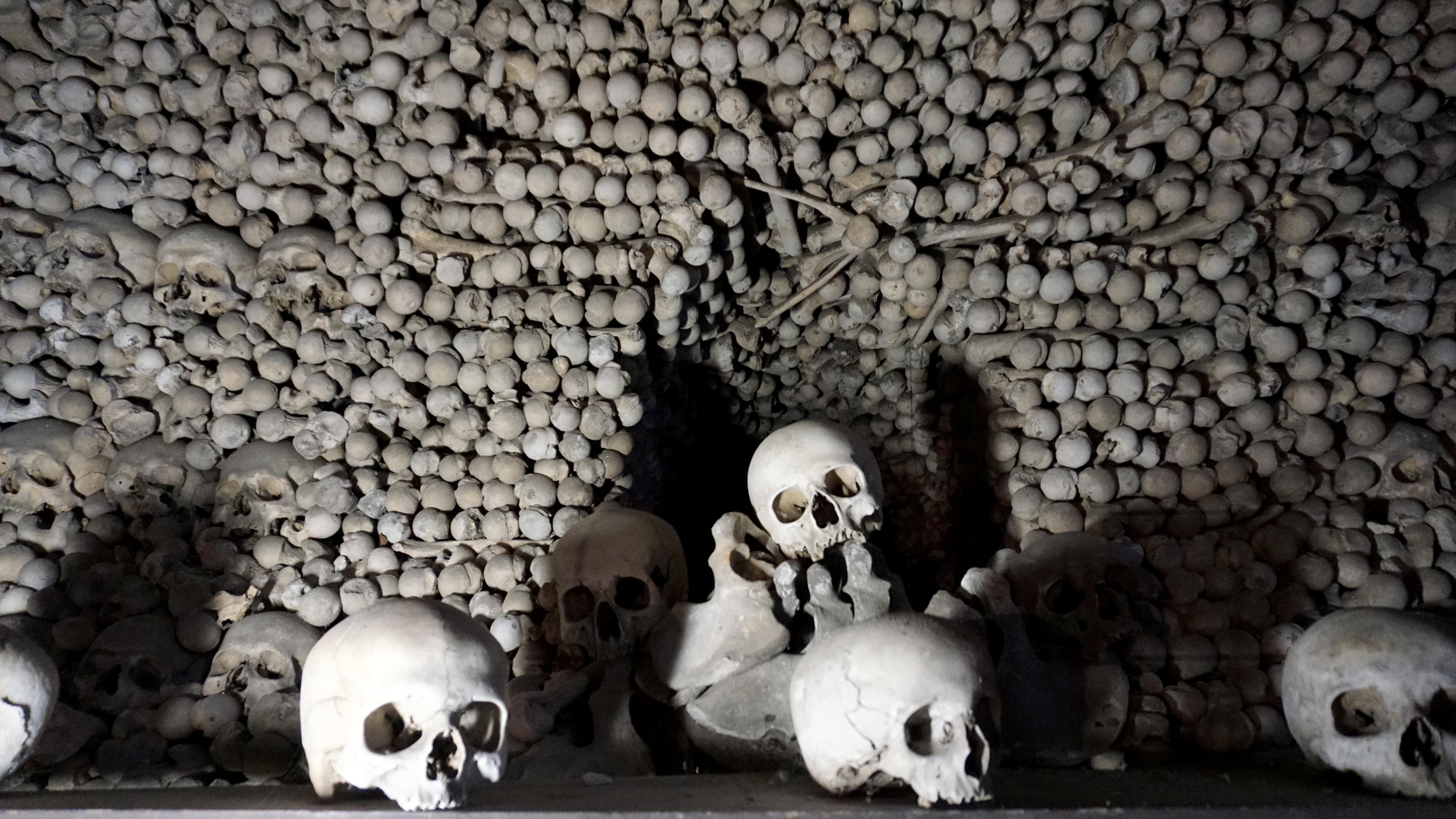 A long time ago, a person of the cloth brought some special dirt back from the Holy Land. This dirt was said to be sacred and special for burial and the resurrection. This caused many people to want to be buried at a small chapel near the big cathedral. Then, tens of thousands of people died very quickly from the plague. They needed burial somewhere. Then, there was this war, the 30-years war, when thousands more were killed in a relatively short period of time. The keepers of this small chapel took the bones of all of these casualties and beautifully arranged them in their crypt.