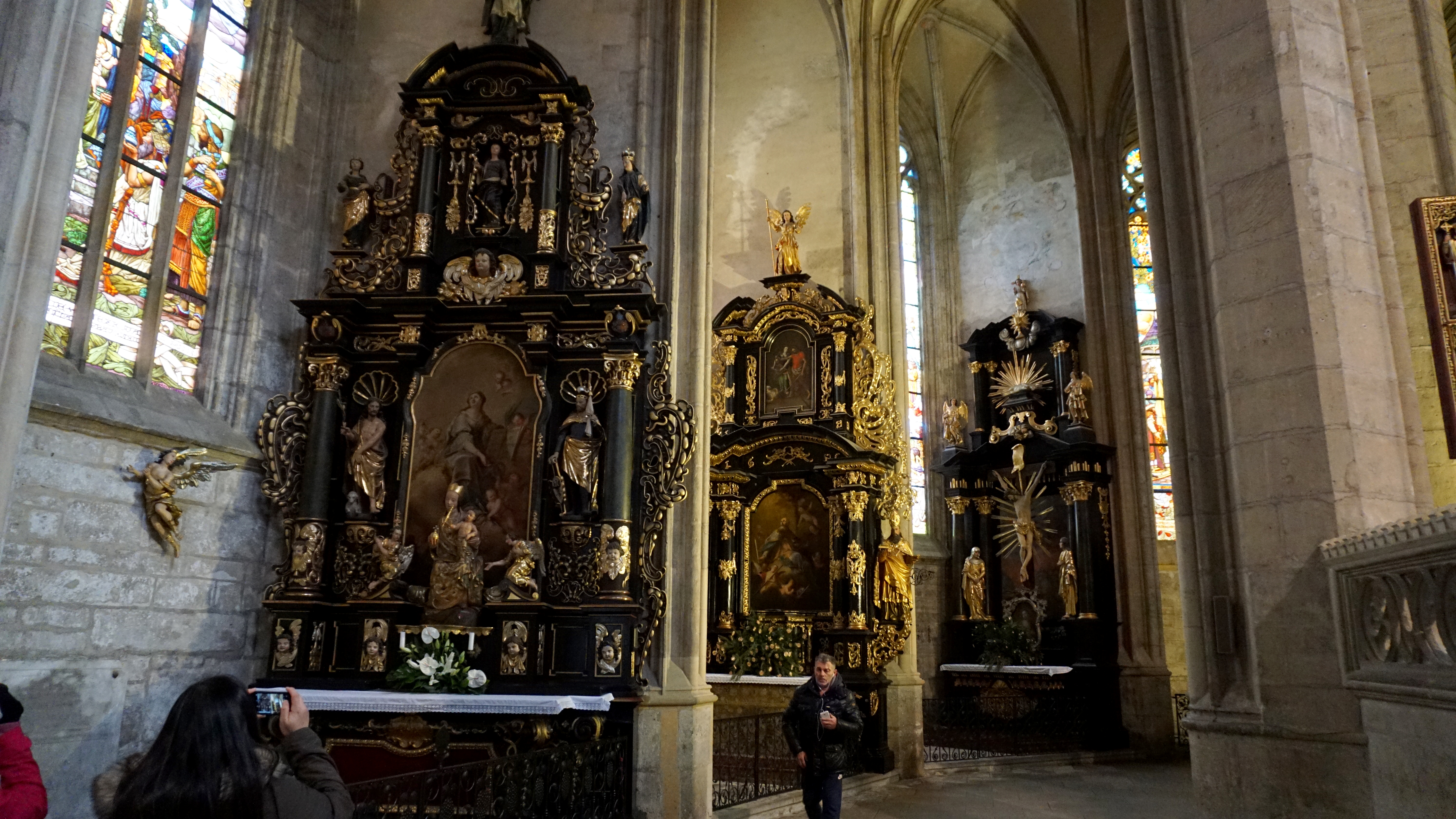 At the other end of the town, a magnificent gothic cathedral crowns the top of the hill. St. Barbara’s is large as it is, but it is only half the size it was supposed to be, kind of like St. Vitus for most of its history. The architectural details are spectacular, especially its flying buttresses. Inside, light pours in from massive windows above the galleries. Altar pieces, some grand and others simple, sit in niche chapels around the back of the nave. A handful of original, beautiful frescoes grace the walls. Stained glass filters the light in brilliant colors on the lower windows.