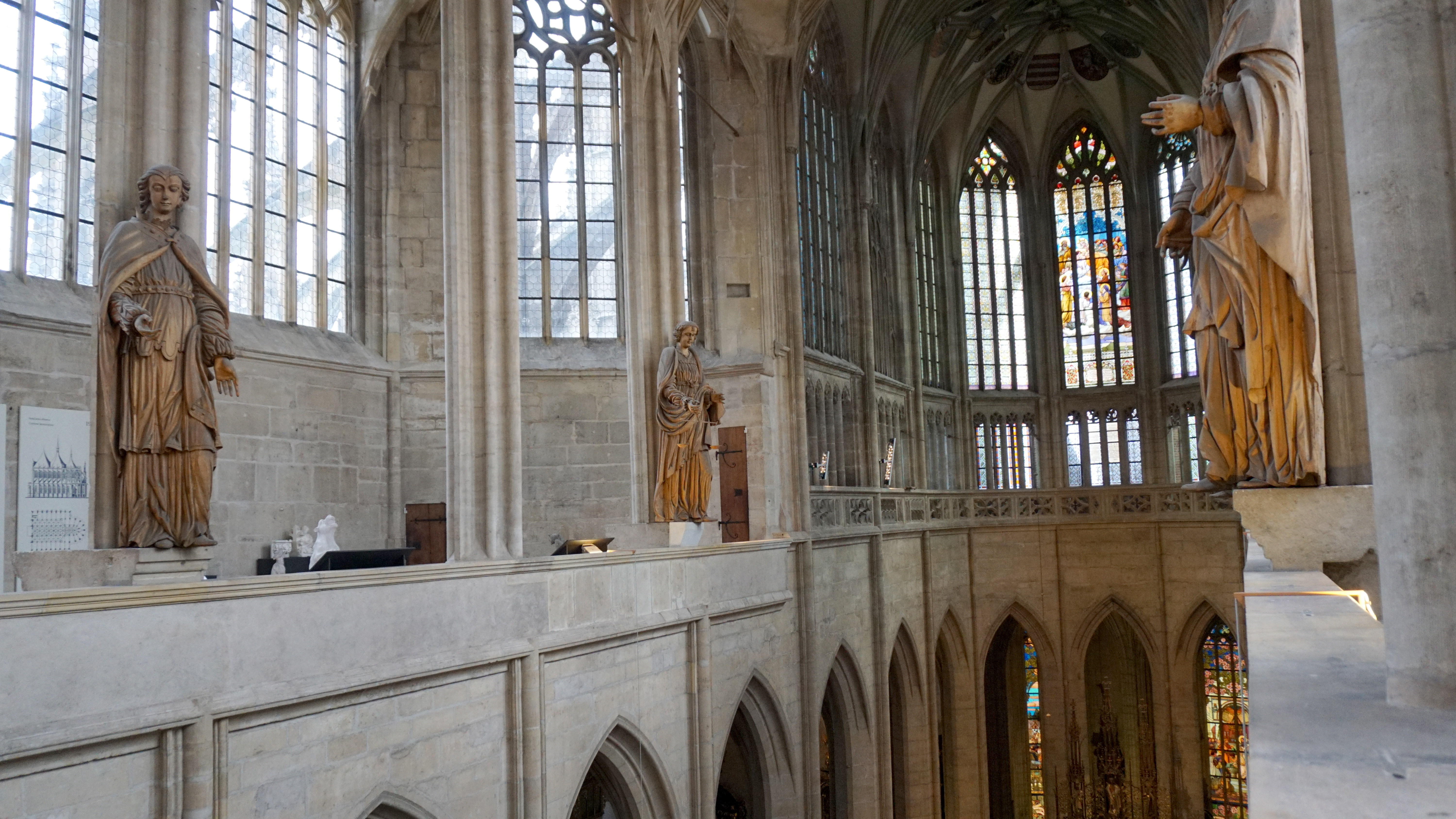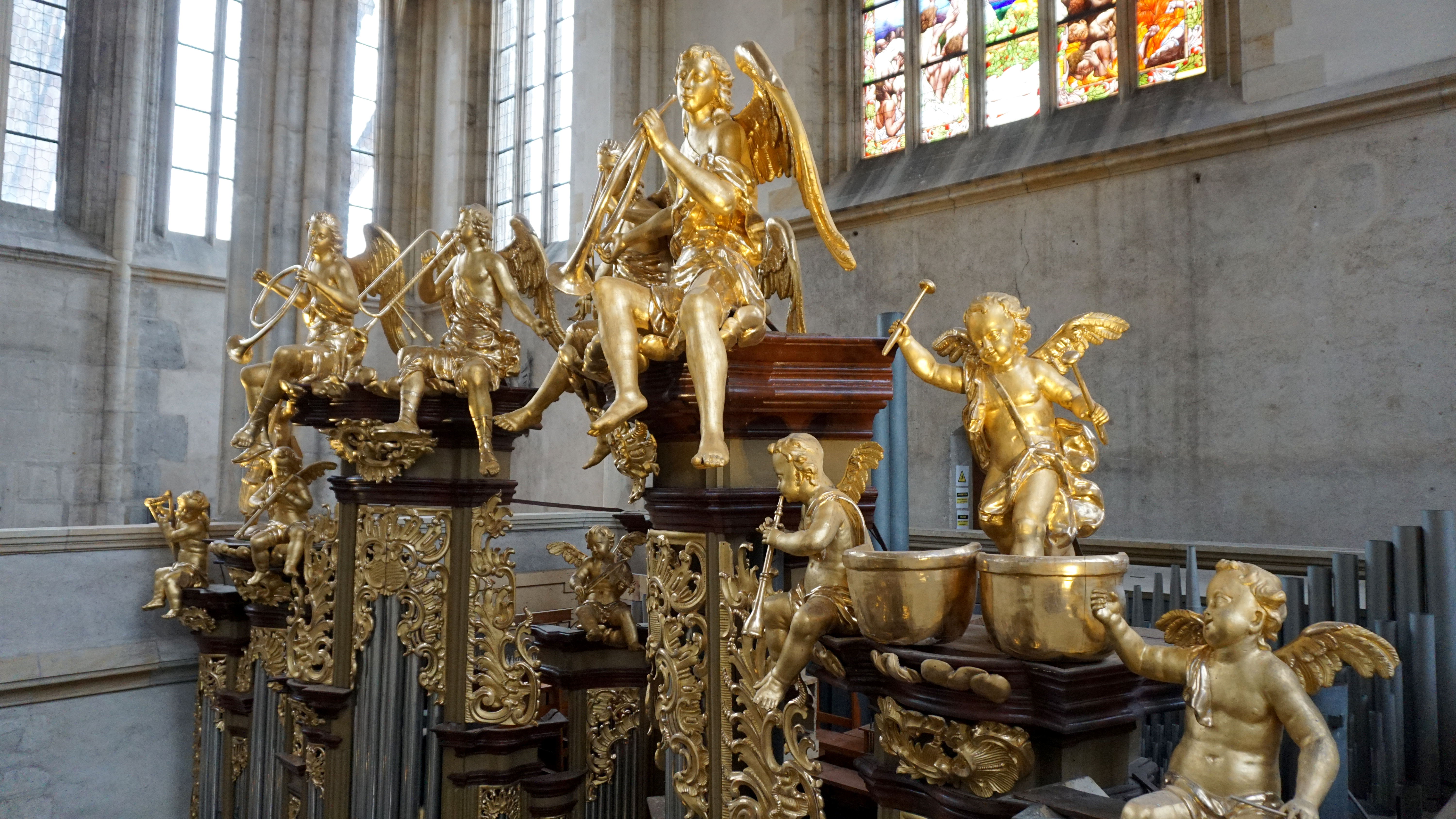At the rear of the nave, a magnificent baroque organ reigns from the loft. I climbed the stairs to the gallery and got a great view of the musical angels from many angles. I also loved seeing the buttresses out the windows supporting the building.