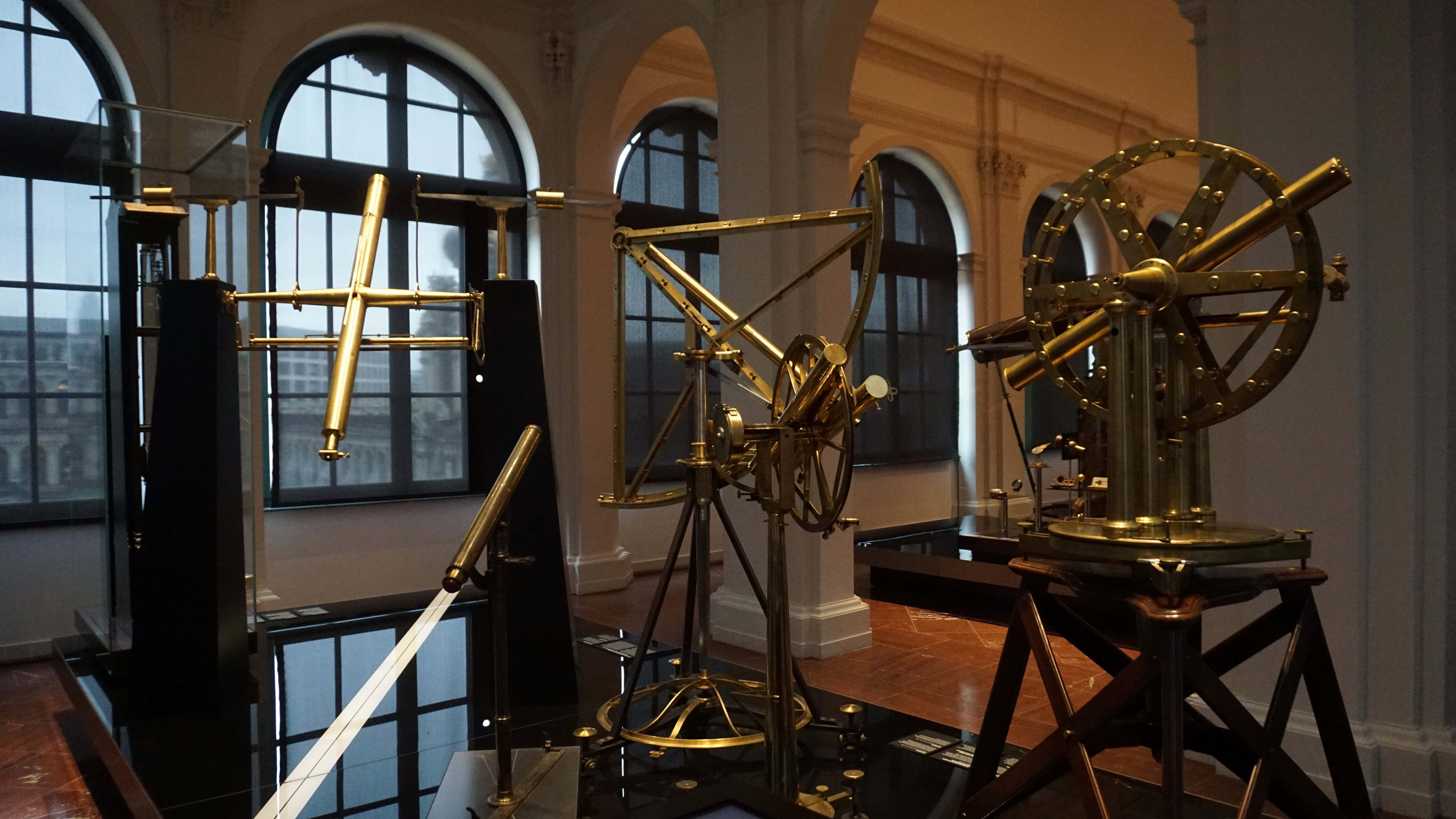 Augustus also collected scientific instruments and mechanical curiosities. During his life, people around the globe studied the stars and the movement of the planet. They created new instruments to take measurements and made fascinating devices to display their findings, like astronomical clocks. The collection has three main areas. One displays mostly instruments for measuring the stars, seasons, etc. Another boasts a grand collection of time pieces in addition to globes and other various tools. Then, upstairs are some large curiosities including parabolic mirrors and telescopes.